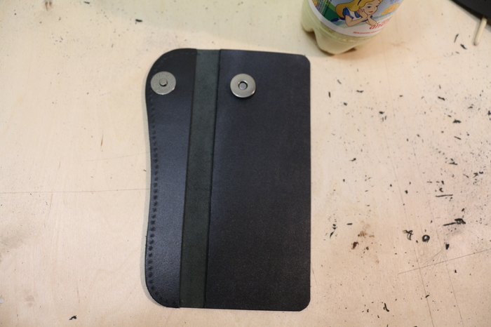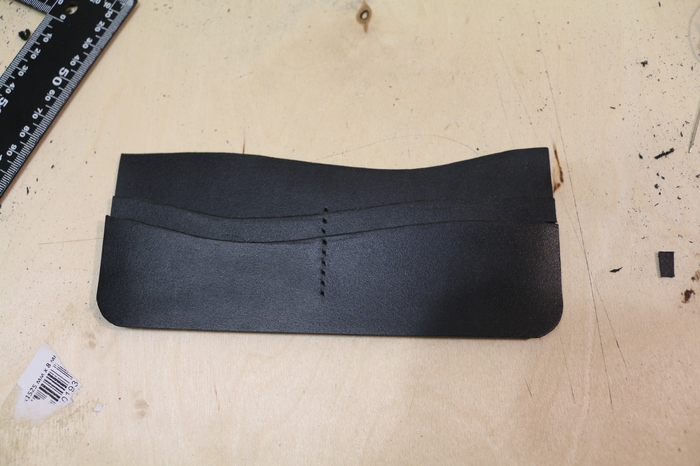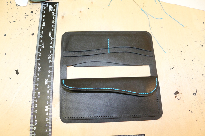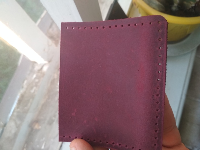 Прошивал я кошель цельной ниткой от сгиба слева (на последнем фото) до сгиба справа. Эстетическая сторона конечно для меня главное, поэтому я прошил и верхний торец изделия. Хотя там просто один слой кожи и шов чисто декоративный.