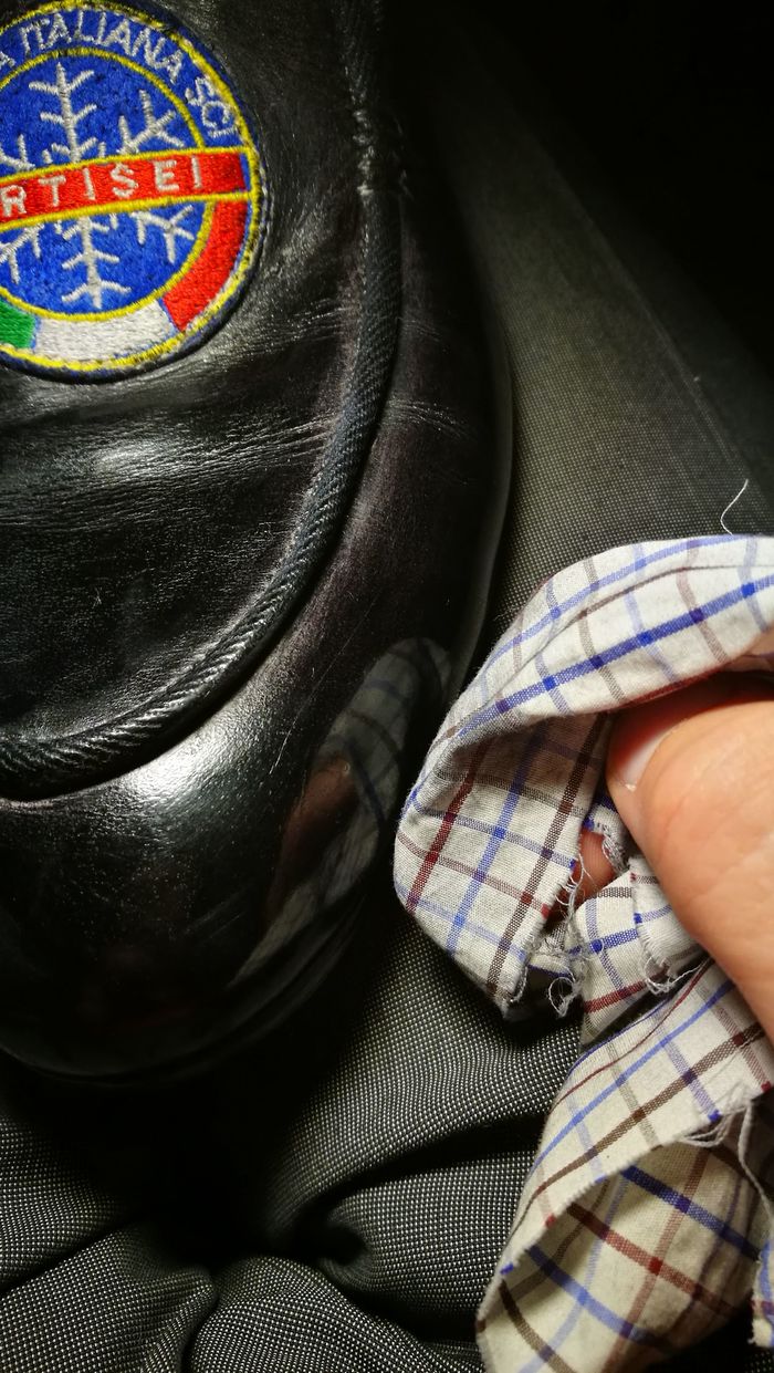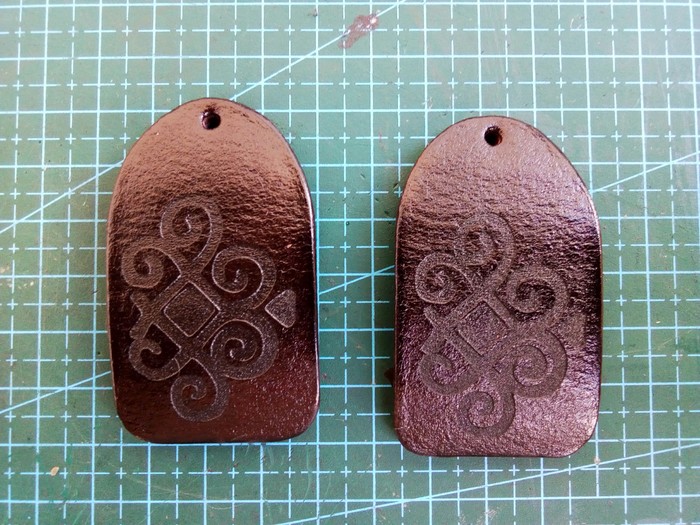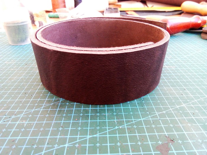 Возвращаясь к предыдущему этапу, после сушки заготовку немного покоробит, но страшиться не надо. Теперь приступаю к окраске. Весь мой опыт художественной школы благополучно похерен, поэтому не о каких сложных рисунках речи не идет, благо на данном изделии ничего такого не требуется, несколько базовых цветов и всё. Под конец заливаем копытным маслом и оставляем на пару суток напитываться и релаксировать. Масло восстановит коллагены и жиры, утраченные кожей при тиснении и покраске спиртовыми красками, проще говоря, вернёт всё д.рьмо, которое мы вышибли из заготовки.