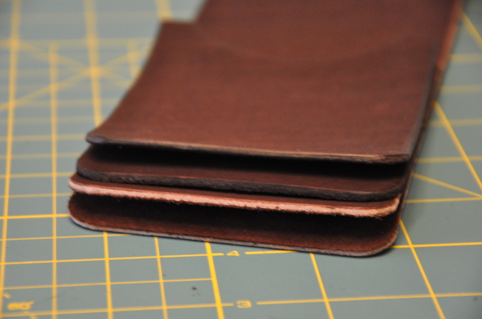 Толстой кожи не было, потому, пришлось клеить в несколько слоев в определенных местах. Как видно на фото - нож вышел 2мм, а ножны на много толще (имеется ввиду под режущей кромкой). Это сделано специально для правки ножа в походных условиях (вся поверхность порыта аброзивным матриалом).