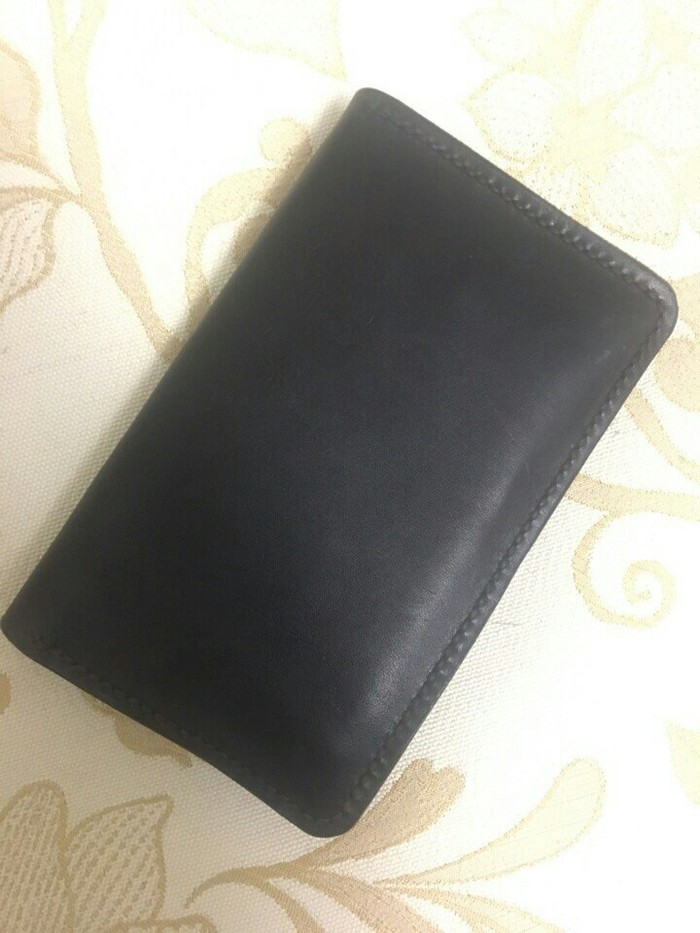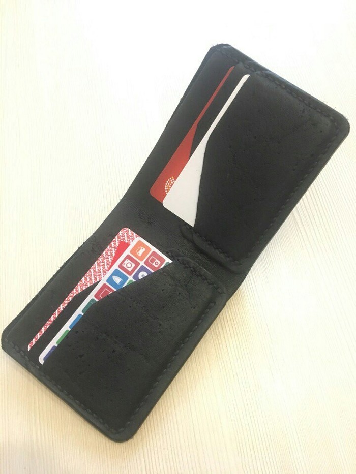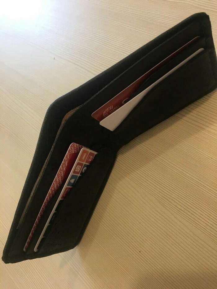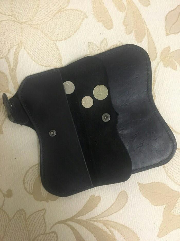 В какой-то момент у меня появилась мысль в голове, а почему бы не сделать себе что-то крутое из кожи. Посмотрел видео на ютубе, желание только усилилось. Но как это часто бывает, идея эта позабылась, но через несколько недель у меня в голове щелкнуло, и я сходил в ближайший магазин с тканями, и купил там обрезки кожи на 50 рублей, шило и нить. Я, как технарь, люблю практичность, поэтому решил сделать себе максимально компактный кошелек, тем более, что меня ограничивали маленькие обрезки кожи. Получилось вот что: отдел под купюры, 3 карты, мелочь.