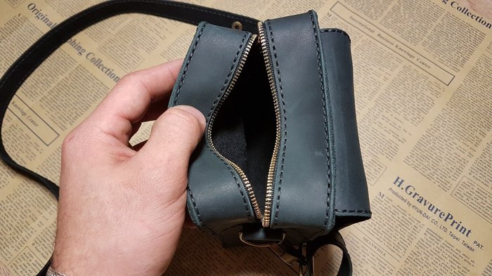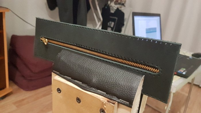 Первый карман- накладной:) уголочки собраны крестиком, по мне, то вполне себе аккуратно выглядит, соответсвенно пришила его и также пришила молнию ко второму отделу.
