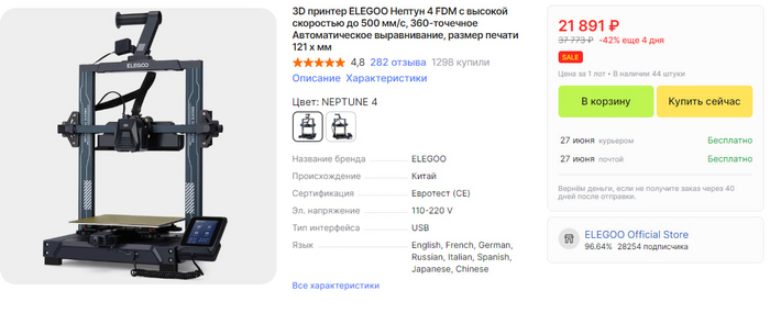 Простенькие принтеры начинаются от 10-15 тысяч рублей, а промышленные образцы могут стоить несколько десятков и сотен тысяч. По запросу 3д принтер для начинающего, желательно с печатью практически из коробки, без головной боли и молитв богу машины я остановился на нескольких вариантах. Flying bear ghost 6, ELEGOO Neptune 4, ELEGOO Neptune 3 pro. Призрак очень расхваливали в видосах на ютубе, у него есть термокороб, удобный для разбора экструдер, и по стоимости он выходил в районе 25 к на али.