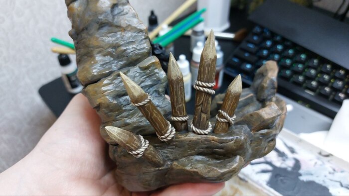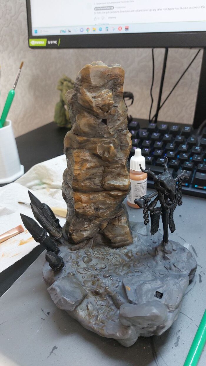 Самой сложной частью тут оказалась подставка. Нужно было создать текстуру настоящей пещеры. Я пересмотрел целую гору реальных фото и подобрал для себя что-то в меру темное, но в то же время интересное по рисунку.