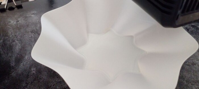 Крайне рекомендуется закрытый корпус. Во время печати тестовой модели я открыл дверцу принтера что бы поправить видеокамеру секунд на 10, и кайма со стороны дверцы бодро отскочила, что создало лишние напряжения в детали. Коробления самой формы не произошло, деталь ровная, но в первых слоях образовалась трещинка.