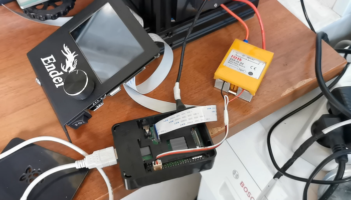 Давно хотел сделать так, чтобы принтер сам выключался после завершения печати (после того как экструдер остынет до заданной температуры). Ну и чтобы можно было включать/выключать принтер удаленно, в том числе со смартфона. Сразу скажу, что к принтеру уже подключен по юсб raspberry pi 3b+ с установленным ПО Octoprint. Изначальной целью подключения "малинки" было желание наблюдать через видеокамеру за процессом печати удаленно (камера родная подключена к "малинке" шлейфом). На фото ниже видна и валяющаяся "малинка" в черном корпусе и камера в синем корпусе, соединенная с ней белым шлейфом.