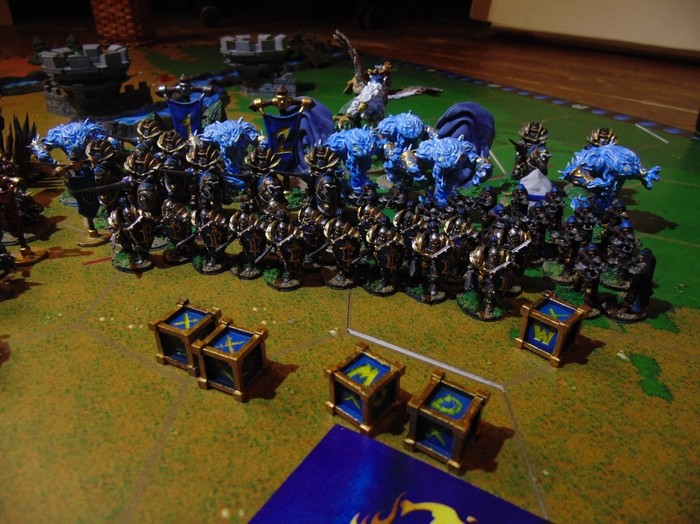Тоже самое и для Альянса. Всего с каждой стороны по 15 юнитов ближнего боя, 15 дальнего, по 9 всадников и 6 существ + по 1 мегаюниту. И того порядка 90 миниатюр, не включая терреин (башенки, лесочки). Ну и маркеры, по мелочи. Всё покрасил аж за 7 дней, работал по 10 часов, но это другая история)