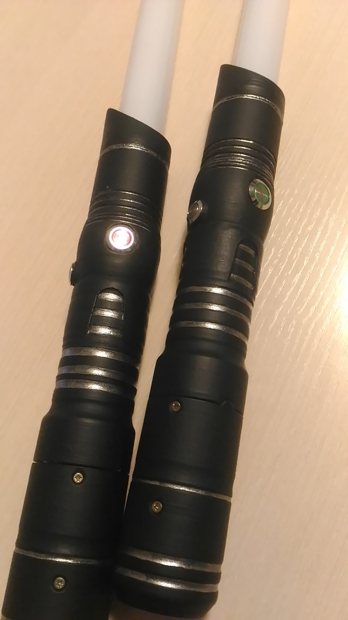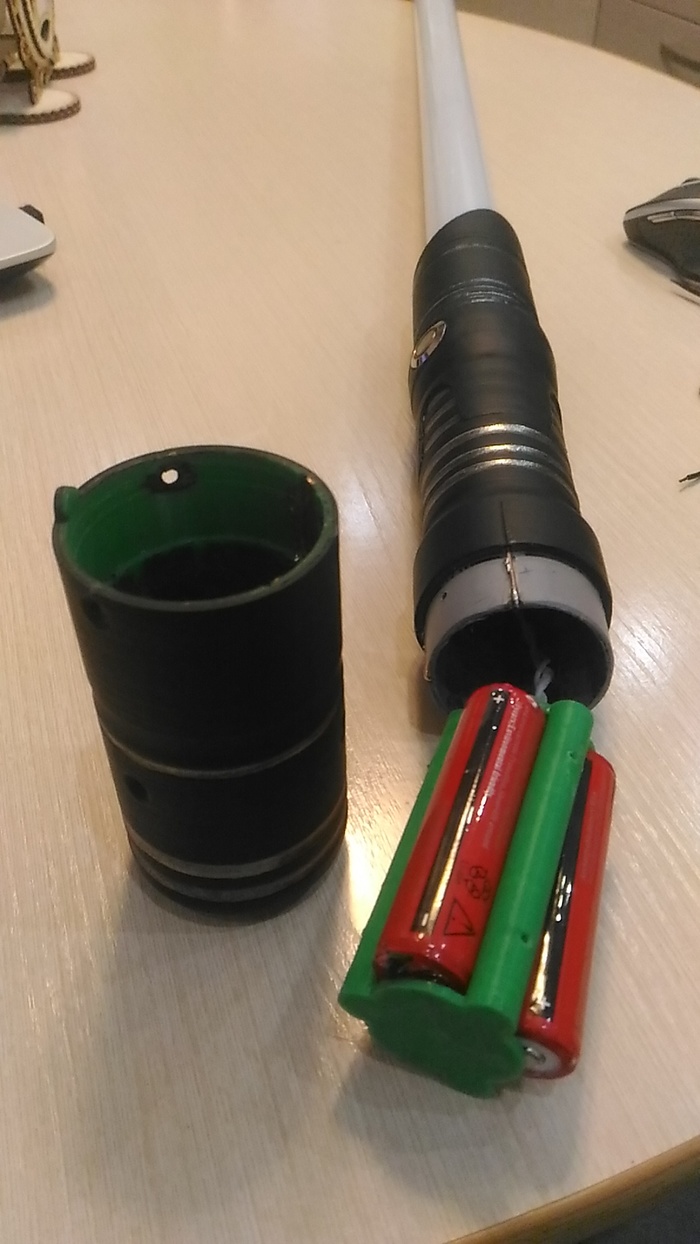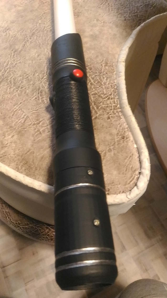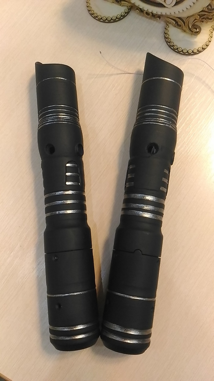 диаметр ручки ограничен - т.к. "внутренности" в ручку меньше 40 мм запихнуть не получиться (из-за связки трёх батареек 18650), + взять в руку рукоять диаметром больше 40-44 мм уже не комфортно. Уменьшить диаметр можно было бы (изменив расположение аккумуляторов) , но тогда увеличилась бы длинна и это уже было бы ближе к джедайской катане, чем к мечу.