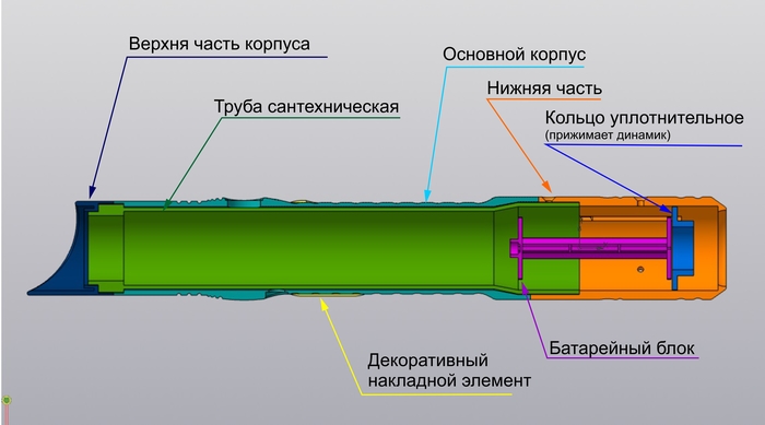 Решено было оставить ручку из сантехнической трубы, но распечатать корпус и надеть на трубу сверху. + это решение давало возможность сделать присоединяемый батарейный блок (ББ). По мере моделирования было три варианта ББ.