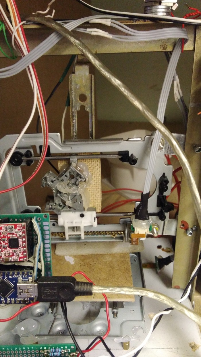 Давно хотелось смастерить что ни будь тридешное. Для начала не очень сложное, что бы освоить азы работы с шаговыми двигателями, драйверами и т.д. В результате получился лазерный гравер.Не судите строго, сам понимаю, что выглядит страшно, делал из того что было под руками. Сам удивляюсь тому что эта штука вообще у меня заработала. Лазер выковырял из CDшника, но мощности его не хватает для прожига, заказал на Али,-жду пока...