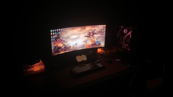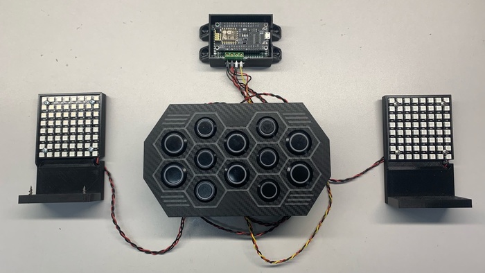 Кажется на этом всё. Не забываем, что всё это большой эксперимент. Так оно выглядит сзади. Потом напечатаю крышку для плат. А может не напечатаю. При тусклом свете это всё потребляет половину ампера. Вполне можно запитывать от компа. Да, сделать общее питание для плат и подсветки можно но мне хотелось оставить именно так, что бы кнопки имели своё отдельное питание от батареек. Ах да, конкретно эти платы в Алису прокидываются коряво. Ждём когда Яндекс интегрирует их в свою систему умного дома но из своего приложения они прекрасно работают, что собственно не мешает ими пользоваться. Подсветка пульта и боковые подсветки на столе могут управляться отдельно. Их линии данных подключены к разным ногам микроконтроллера. В Wled много всяких эффектов, их можно настраивать на свой вкус и цвет. Ссылки будут вероятно в комментах. Далее видео работы и мой бубнёж на камеру. Опять тихий звук. Смотреть наверное лучше в наушниках, в тишине. Пикабу режет видос до трёх минут. В принципе далее ничего интересного или полезного не было. Проходной выключатель в прохожую так до сих пор и не повесил(