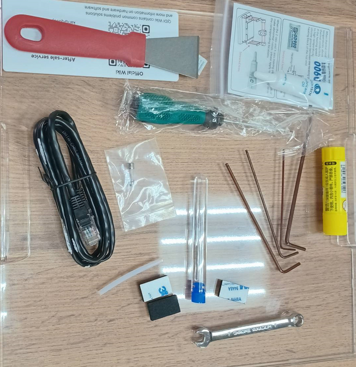 Комплектация: кронштейн для бабин пластика, шпатель, инструкция, провод питания, флешка с ПО, клей, смазка, отвертка и шестигранники и прочее