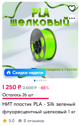 Филамент зеленый шелковый от НИТ. Тоже Россия, Волгоград. Здесь зип-пакет идет отдельно. Вот с ним возникли проблемы. Производитель написал 230, я выставил, но все равно периодически вылезали торчащие во все стороны прутки, с адгезией к столу тоже проблемы, промазывал все клеем, но иногда и он не помогал.