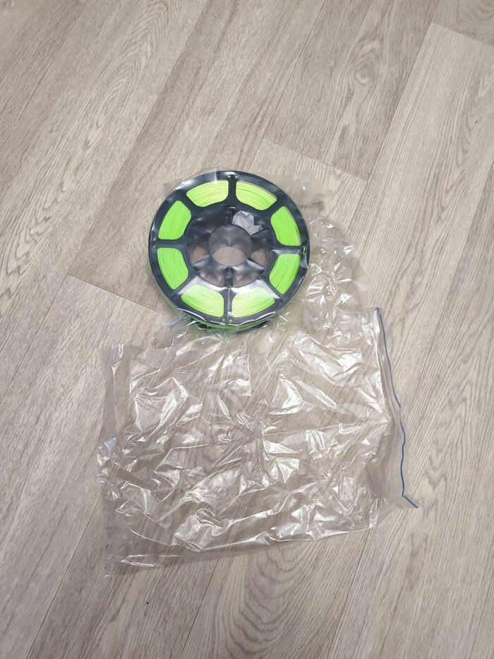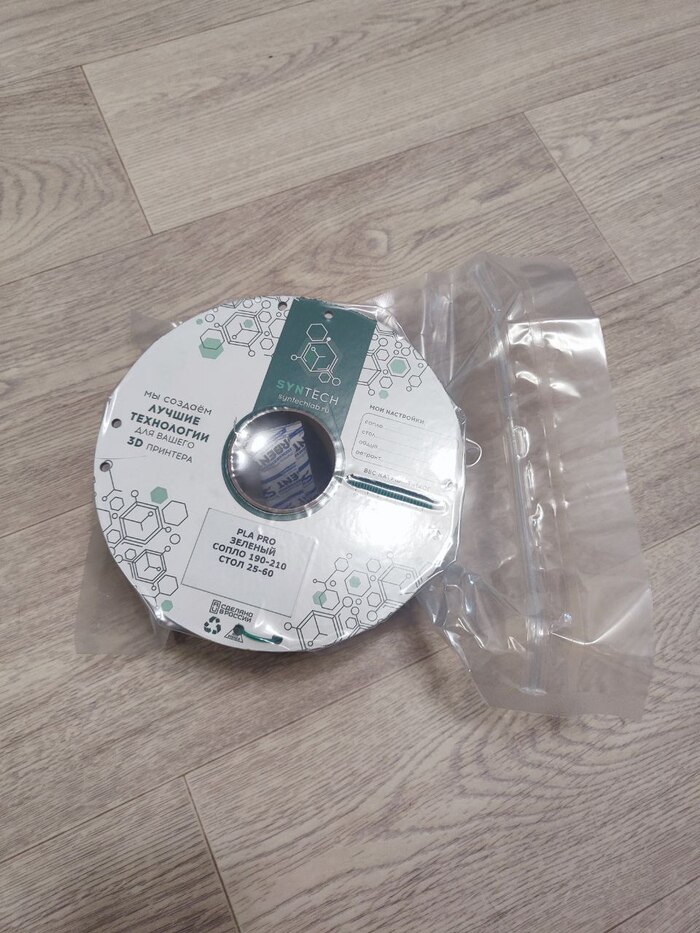 Филамент Syntech, зеленый. Производство Россия, Нижний Новгород. В целом с этого производителя начал, уже 5 катушка, покупал и PLA и PETG. Нареканий у меня не вызывает, отдельно доставляет зип-пакет, и удобная катушка с определителем остатка. Печать 210/60, со стола не убегает, имхо хороший.
