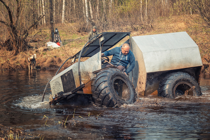 Используя негативный прошлогодний опыт мы довольно удачно осуществили переход реки. Хоть и пришлось задействовать лебёдку, но машина даже не заглохла. Пока мы думали как лучше всё сделать, Буран вытащил свой корм из мешка и закопал в лесу видимо планируя вернуться сюда позже))