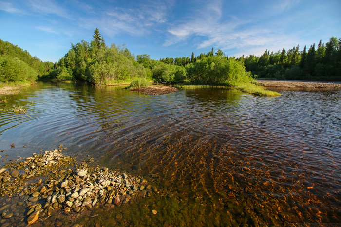Река в этом месте обходит несколько островов, которые делят ее течение. До нужного острова я добрался без проблем, хоть вода и доходила до причинного места, но течения нет и идти не сложно. Дальнейший путь оказался сложнее. Дно усыпано скользкими камнями, которые так и норовят выпрыгнуть из-под подошвы. Течение стало на порядок сильнее, а когда уровень воды поднялся мне до пояса, стоять стало невозможно. Я фактический ложился на воду, упираясь в дно ногами, но меня тащило дальше. Решил, что одному таким заниматься не стоит, и если меня сейчас унесет, то вряд ли кто-то выловит. Вернулся в лагерь.