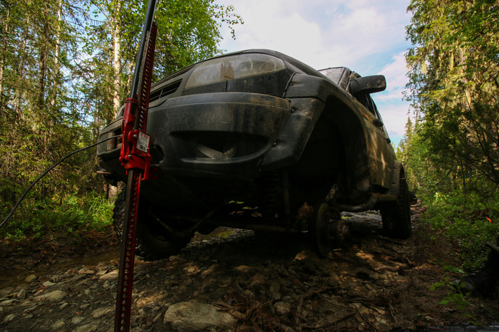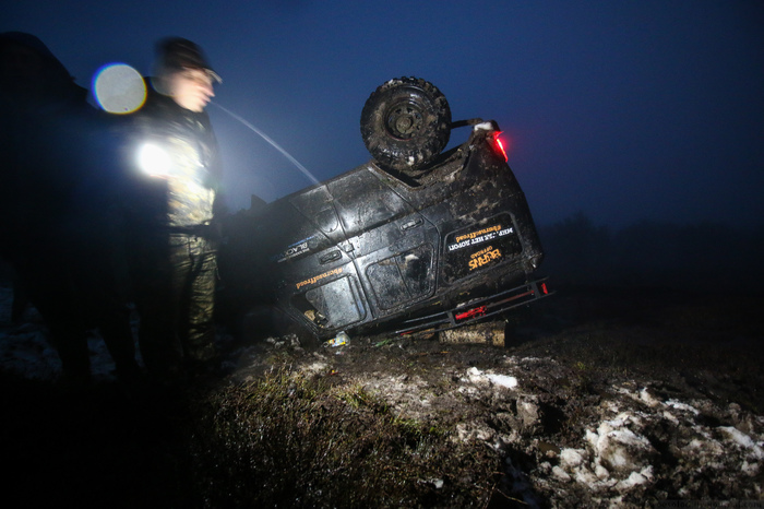 Все произошло в мгновение ока, вот мы только заваливаемся на бок, а вот на меня уже валятся вещи. В этот момент я некстати вспомнил, что у нас пол салона завалено запчастями, а это довольно увесистые железяки. К счастью обошлось, немного прибило генератором, но в остальном отделался испугом. Схватил рюкзак с ноутом и фотиком, выбил ногой дверь, и вырвался на свободу. Воздух уже не казался таким холодным, а мокрый ветер больше не был противным. Я вздохнул полной грудью, уфф, живой. Стало понятно, что сегодня мы до точки не доберемся. Все устали и измотаны, из-за погоды все замерзли и сырые. Нужно вставать на ночевку и разводить костер. Ночевать на склоне прямо где все случилось!? Не лучший вариант. Надо спускаться со склона ближе к лесу. Хорошо хоть в нашей группе не было разногласий по этому поводу. Но для начала надо было поставить уаз на колеса. Снова возникла сложность, уаз лежал фактический на краю крутого склона, еще поворот мог спровоцировать падение в бездну.