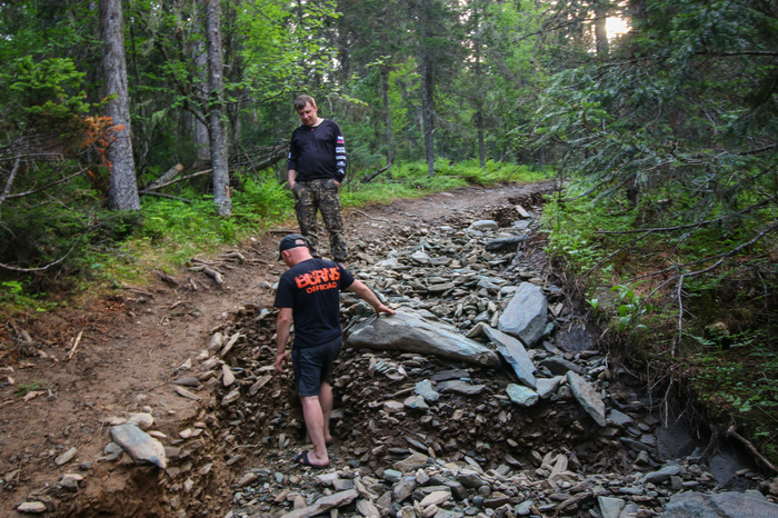 Солнце все близилось к горизонту, наша цель постепенно становилась ближе, а дорога хуже. Приходилось подниматься под большим уклоном, объехать валуны, и стараться не распороть шины об острые камни. Так как в этом году мы ехали первыми этим маршрутом, приходилось пробивать путь через все препятствия.