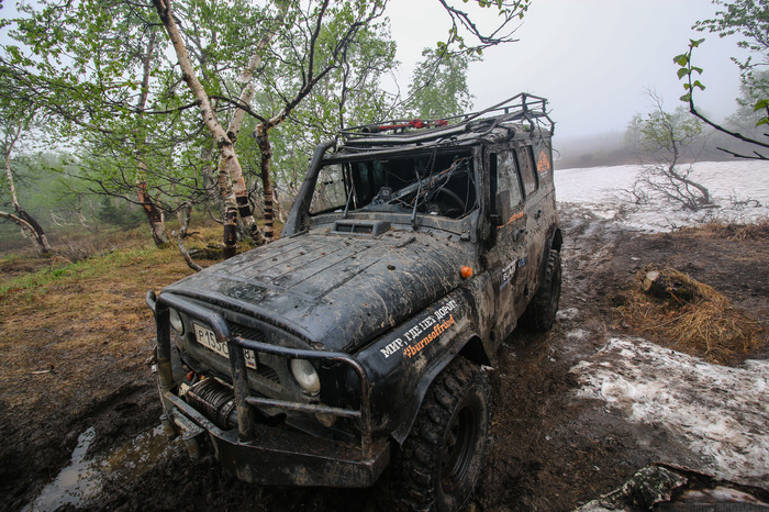 Часто вам удается покопать снег в начале июля!? Мне такой шанс выпал. Пытались вытянуть хантер вверх по горе, там, где нет снега. Тащили двумя квадриками и толкали всей толпой, но соотношение масс было слишком разным. В итоге решили столкнуть вниз на снег. Не сразу, но уаз пошел и спокойно спустился по снегу в начало склона. Теперь надо снова штурмовать гору. Все это время шел дождь со снегом, почва сильно размокла, и без того плохое сцепление, стало совсем отсутствующим. Напряжение летало в воздухе, наша цель была так близка, вместе с ней нас ждал горячий ужин и теплый прием, но мы никак не могли до него добраться. Люди были уже на предел, а техника и подавно. Мои дырявые кроссовки уже промокли насквозь, вместе с ними промокли штаны и куртка, стало очень холодно. В какой-то момент я решил залезть в уаз чтоб погреться, в это время он не прекращал попыток подняться в гору. Тут было тепло и сухо, вполне себе уютно. До того момента, как машина, в очередной попытке, налетела на кочку. В результате крена автомобиля превысил максимально допустимый и мы плавно легли на бок. На этом все бы и кончилось, но физика была не на нашей стороне. На верхнем багажнике были два больших колеса, и целый набор дров. Весь этот груз продолжил нас тянуть в ненужном направлении.