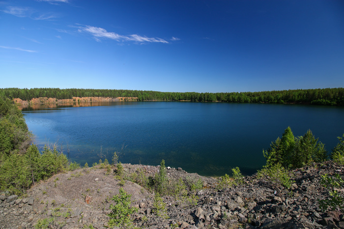 После Ивдели заканчиваются блага цивилизации, в том числе и асфальт. Следующие несколько сотен километров трясемся по грейдеру, периодично натыкаясь на какие-то интересные места. Например, вот это озеро, которое никакое не озеро на самом деле, а бывший карьер. Вокруг накидано множество пустой породы, которую усердно дробят на гравий. Изначально я думал мне показалось, что там под водой деревья целые. Как позже стало известно, примерная глубина этого озера-карьера, около 180-200 метров. В таком утонешь, никто и никогда не узнает.