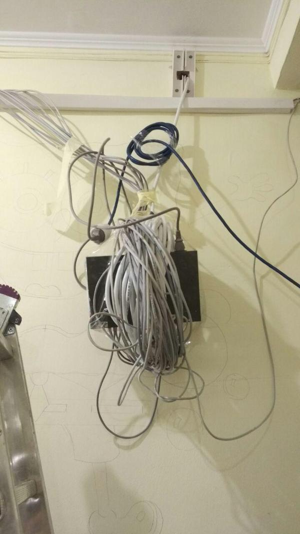 Позвали нас с знакомым на один объект, сказали нужно переместить хаб в другое помещение(подсобка) и провести туда все провода на время ремонта, пришли на объект и оценив масштабы работ оба решили что не нужно переносить в другой кабинет а закрепим в коридоре .Ремонт не капитальный а просто красили стены и ради такой мелочи сверлить дырку в стене в подсобку ради то что бы он простоял там 3 дня было глупо. но шуруповерта под руками не было и в конечном итоге мы закрепили его вот так, и обмотали скотчем что бы не упал, вот так вот.