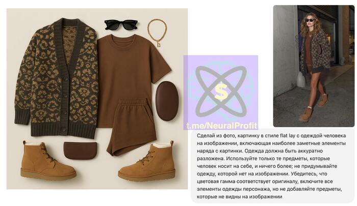 Сделай из фото, картинку в стиле flat lay с одеждой человека на изображении, включающая наиболее заметные элементы наряда с картинки. Одежда должна быть аккуратно разложена. Используйте только те предметы, которые человек носит на себе, и ничего более; не придумывайте одежду, которой нет на изображении. Убедитесь, что цветовая гамма соответствует оригиналу, включите все элементы одежды персонажа, но не добавляйте предметы, которые не видны на изображении