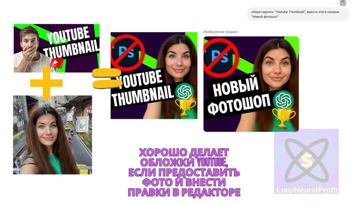 Используя референс обложки видео для ютуб, сделай обложку видео для ютуб с моим лицом. На фоне перечеркнутый логотип Adobe Photoshop и рядом светится логотип ChatGPT с кубком за первое место в руках.