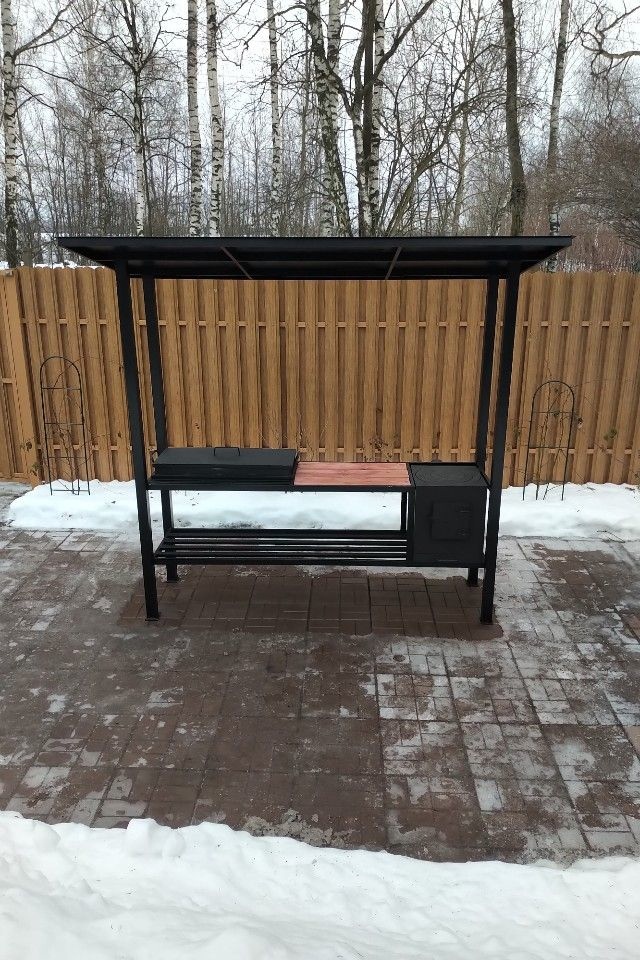 В комплекте: каркас с крышей, съёмная жаровня, колосник жаровни, съёмная печка с наборной плитой.