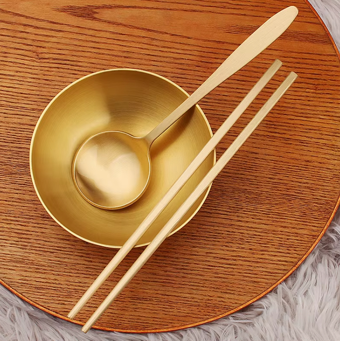 Элегантный комплект из латунной чаши, палочек и ложек в китайском стиле украсит любой стол. Поверхность отполирована до гладкости, а металл придаёт ощущение массивности и качества. Подходит как для сервировки блюд, так и для декоративного использования. Идея для подарка с восточным акцентом.