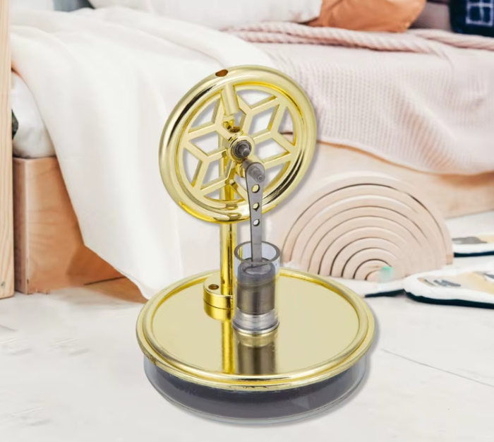 Настольная модель двигателя Стирлинга демонстрирует принципы термодинамики в действии. Работает от свечи или спиртовки, приводя в движение маховик. Используется как образовательная демонстрация или оригинальный подарок. Металлические детали и прозрачные стенки делают модель зрелищной.