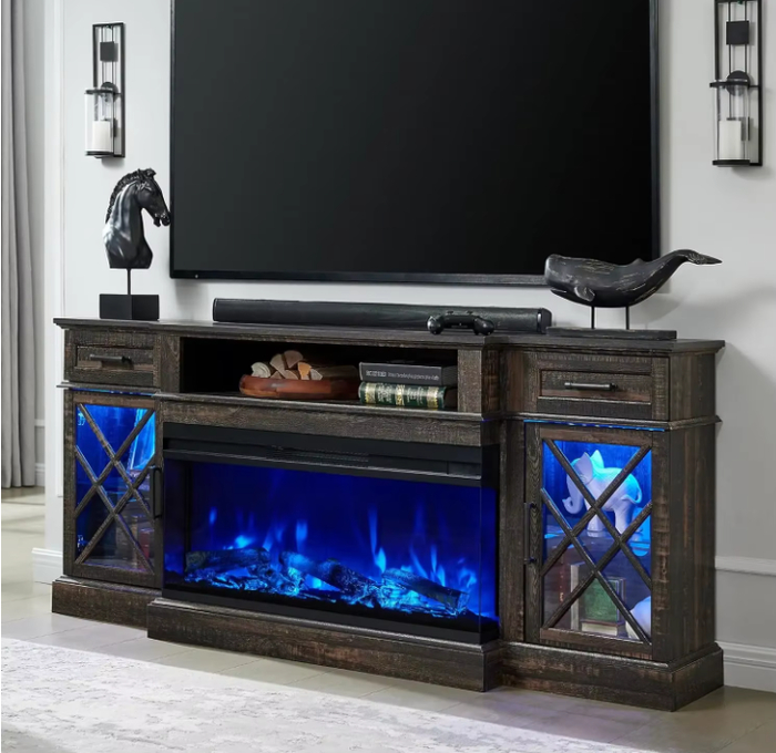 Элегантная подставка для телевизора с встроенным электрическим камином создаёт уютную атмосферу в доме. Три стеклянные стороны обеспечивают панорамный вид на огонь, а возможность регулировки яркости позволяет настроить оптимальный уровень освещения. Идеально подходит для современного интерьера и создания комфортной обстановки.