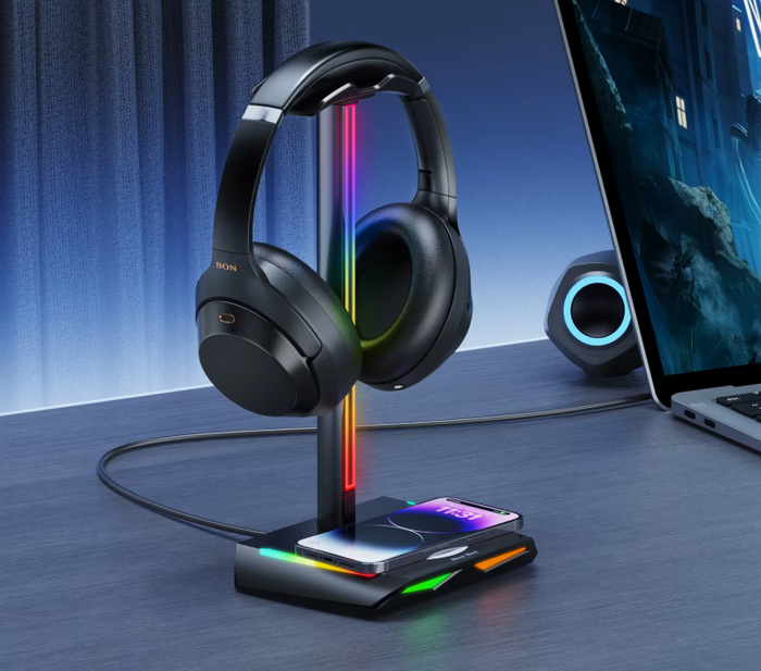 Яркий и функциональный аксессуар с RGB-подсветкой и удобной формой. Надежно удерживает любые полноразмерные наушники, защищая их от повреждений. Имеет встроенные USB-порты для подзарядки и подключения. Создаёт атмосферу и порядок на рабочем столе.