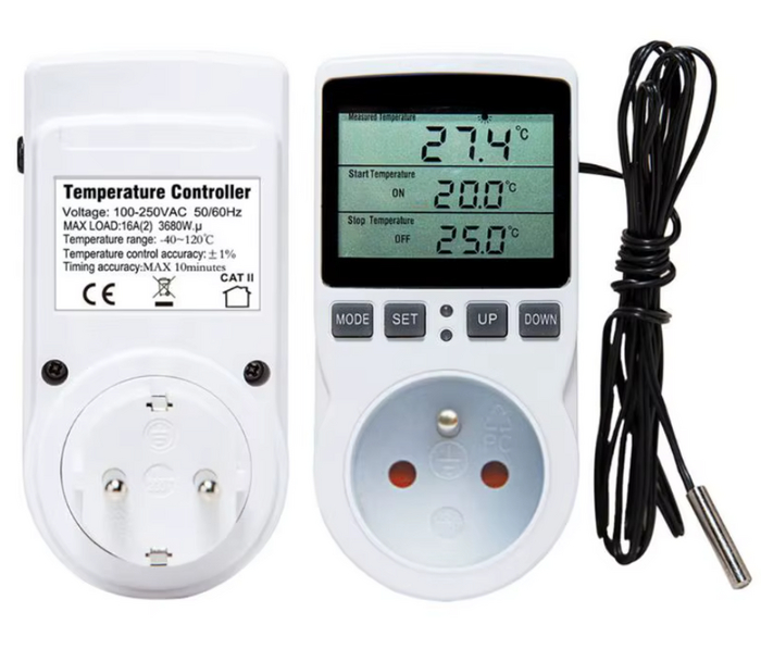 Компактный цифровой термостат с регулятором температуры, поддерживает напряжение 110-230 В и ток до 16 А. Идеально подходит для управления системой отопления, кондиционирования или другого оборудования.