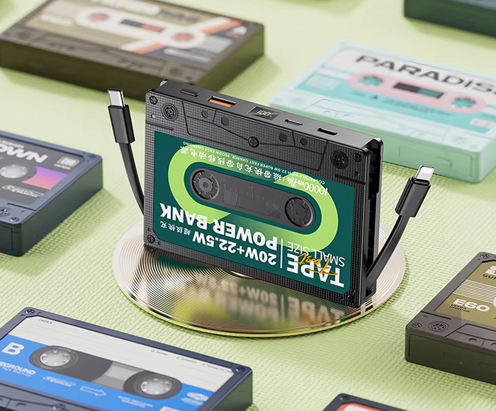 Необычный внешний аккумулятор, выполненный в виде ретро-аудиокассеты. Оснащен двумя встроенными кабелями (USB-C и Lightning), что позволяет одновременно заряжать до трех устройств. Мощность зарядки достигает 22,5 Вт, что обеспечивает быструю зарядку смартфонов, планшетов и других гаджетов. Компактные размеры позволяют легко носить устройство в кармане или сумке.