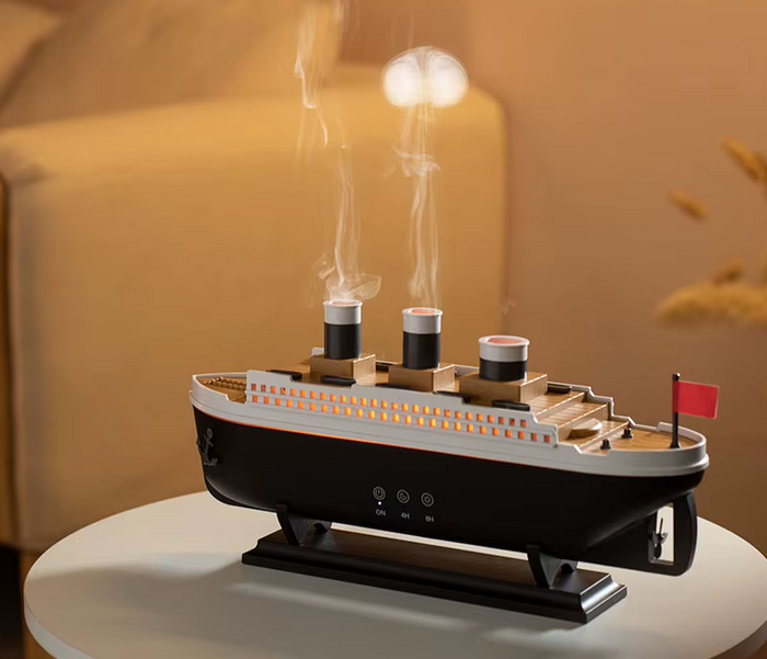 Необычный увлажнитель с эффектной подсветкой. Вода превращается в легкий туман, создавая иллюзию пара, поднимающегося из дымовых труб корабля. Также можно добавлять эфирные масла для ароматизации воздуха.
