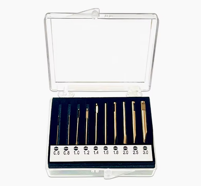 Профессиональный инструмент из латунного сплава для ремонта часов. Имеет сменные прямые лезвия, которые позволяют безопасно снимать крышку корпуса, менять батарейки и проводить обслуживание механизмов. Компактный размер делает его удобным для работы даже с миниатюрными аксессуарами.