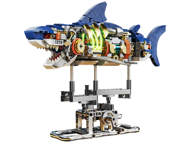 Набор состоит из нескольких сотен деталей, которые нужно самостоятельно собрать в движущуюся модель акулы. При вращении шестерёнок “рыба” шевелит плавниками и хвостом.