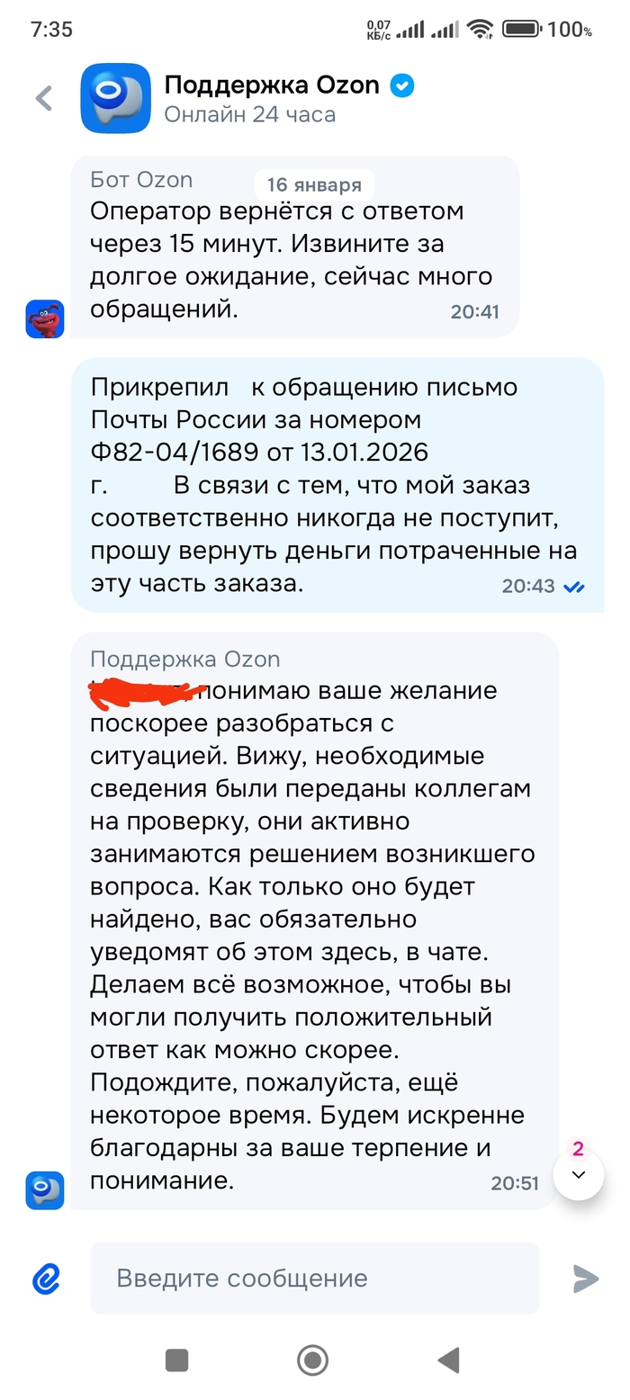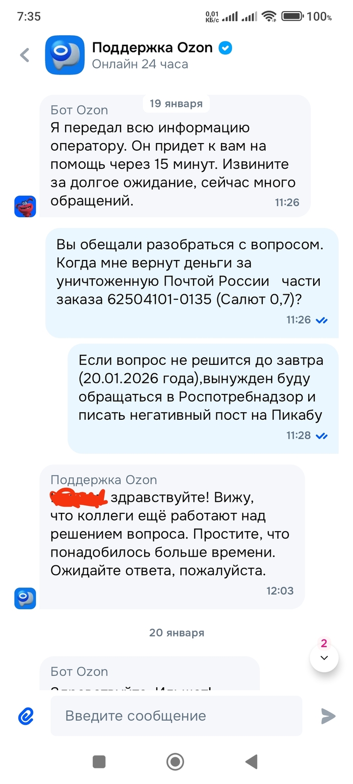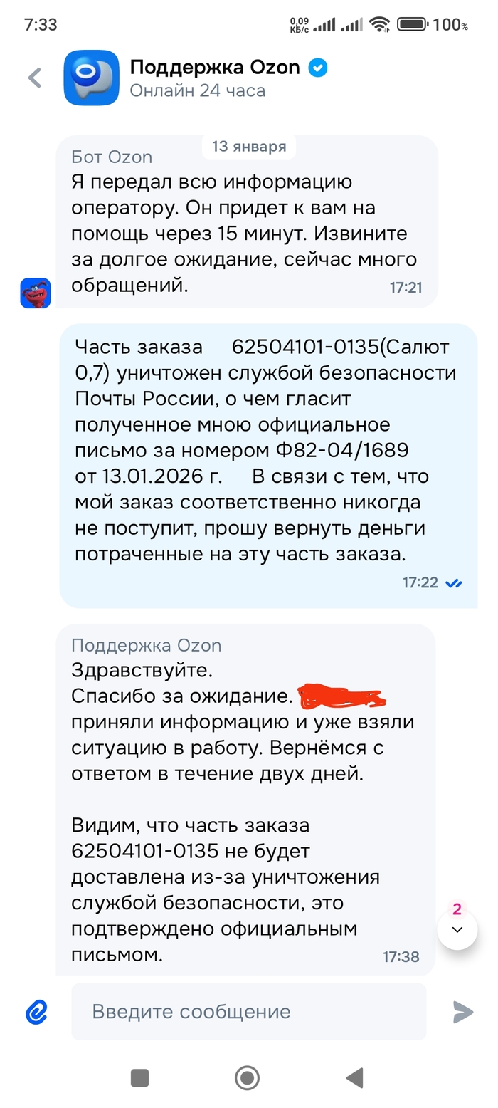 Обращался неоднократно службу поддержки Озон, прикреплял в чате поддержки письмо от Почты Росси, что посылка уничтожена, но к сожалению, они до текущего момента не смогли мне помочь, только какие отмазочные скрипты все время вставляли.Продавец в чате не отвечает. Отменить или вернуть заказ невозможно, пока она не придет по адресу.Самое интересное, что в приложении Озон так и висит информация, что заказ в службе доставки и время от времени обновляют сроки доставки .Короче говоря, и я остался без денег и без товара. Не такие уж и большие деньги конечно, но все равно неприятно такое кидалово.Думаю направить жалобу Бастрыкину в Ропотребнадзор.