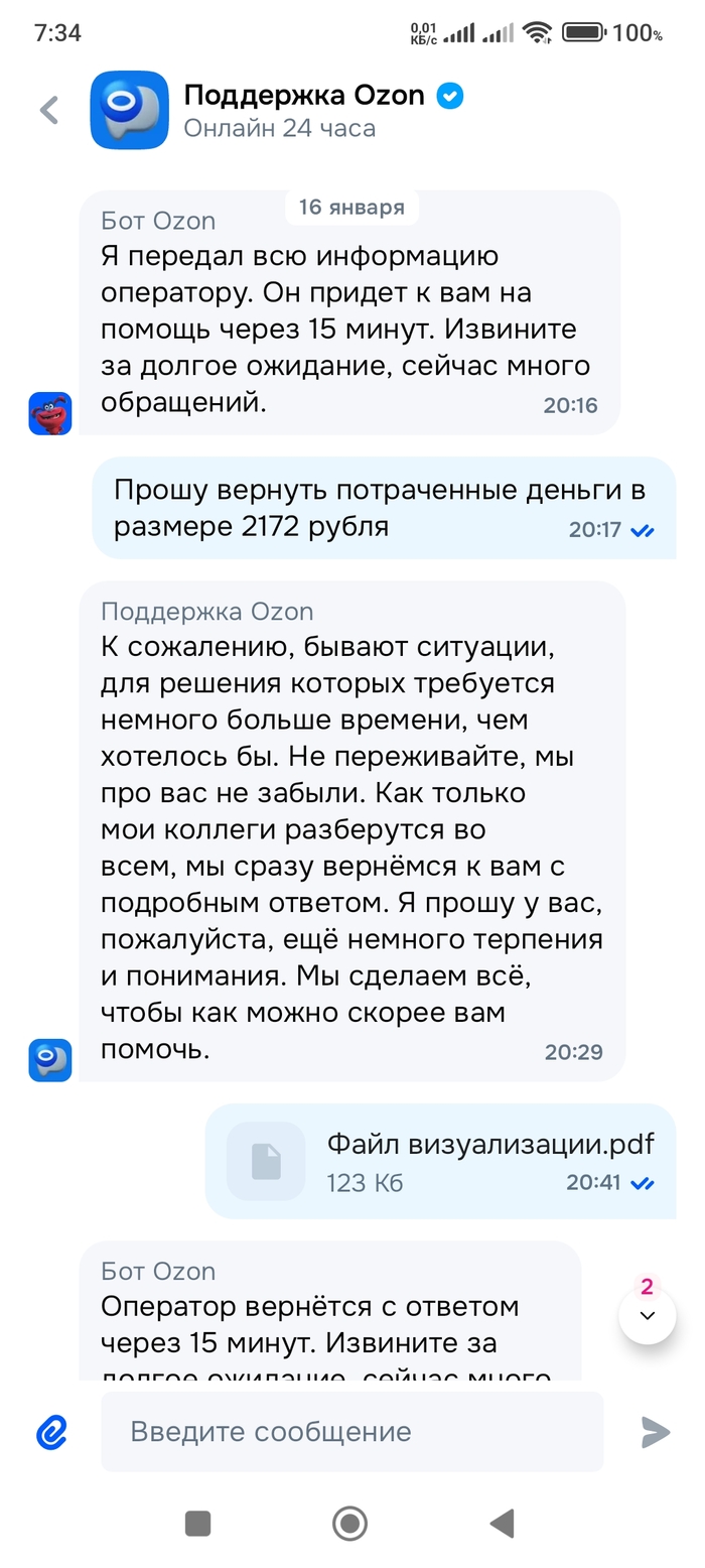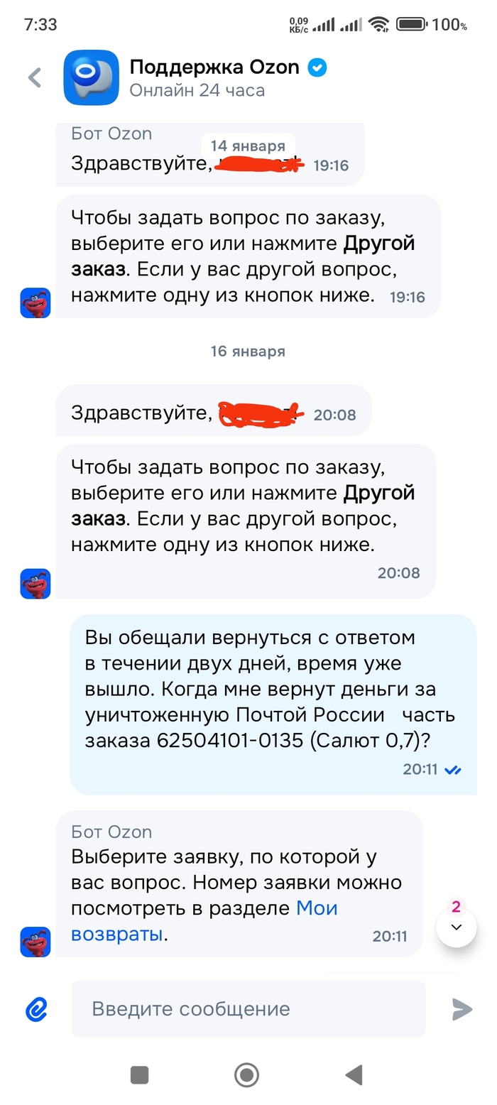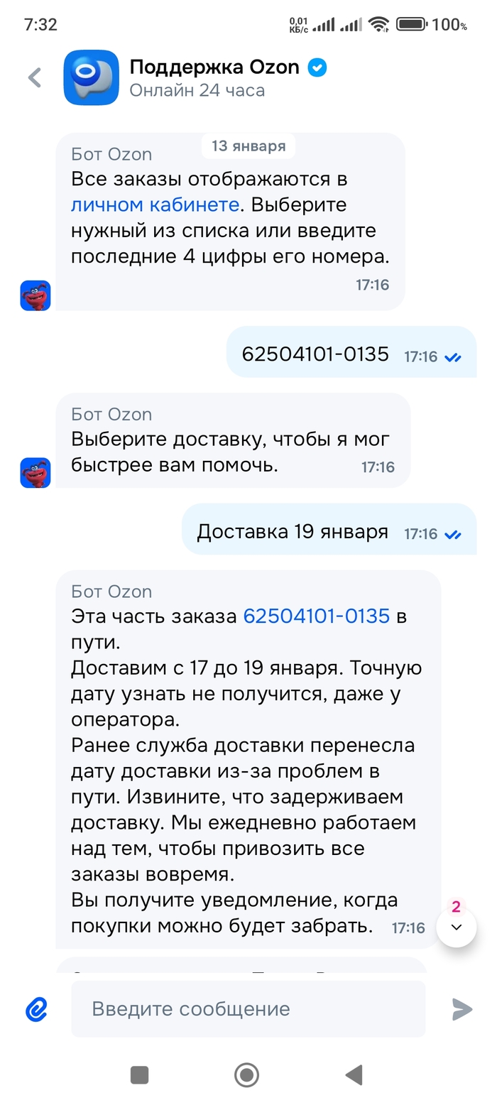 Обращался неоднократно службу поддержки Озон, прикреплял в чате поддержки письмо от Почты Росси, что посылка уничтожена, но к сожалению, они до текущего момента не смогли мне помочь, только какие отмазочные скрипты все время вставляли.Продавец в чате не отвечает. Отменить или вернуть заказ невозможно, пока она не придет по адресу.Самое интересное, что в приложении Озон так и висит информация, что заказ в службе доставки и время от времени обновляют сроки доставки .Короче говоря, и я остался без денег и без товара. Не такие уж и большие деньги конечно, но все равно неприятно такое кидалово.Думаю направить жалобу Бастрыкину в Ропотребнадзор.