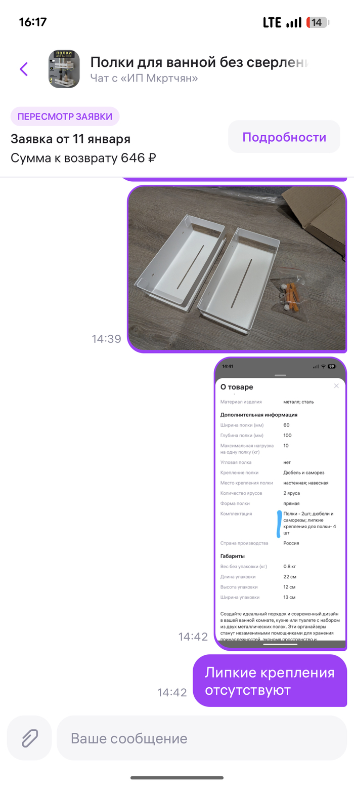 Впервые за долгое время решила вернуть товар в данном маркет плейсе, поскольку продавец не положил все комплектующие для крепления полок, которые были заявлены в списке. Для меня они в текущем наполнении бесполезны. Единственная моя ошибка - обнаружила я отсутствие деталей уже дома.
