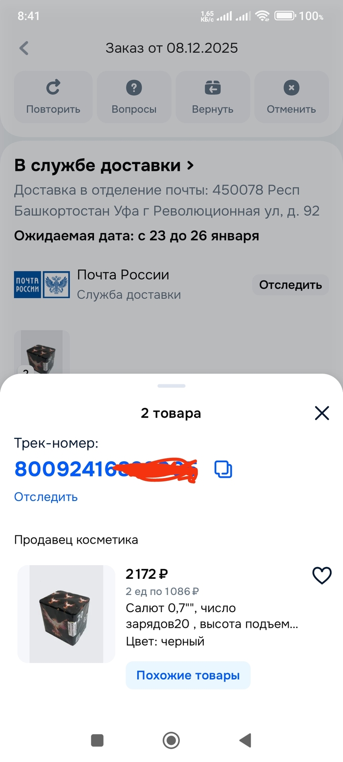 Хочу поделиться своей неудачной историей с маркетплейсом Ozon. 08.12.2025 я заказал и оплатил Салюты на сумму 2172 рубля у продавца "косметика" (ИП Акимова Анастасия Николаевна). Ожидал доставку к Новому году и не дождался. Направил запрос на Почту Росси о розыске посылки, а как оказалось после НГ к сожалению, моя посылка была вообще уничтожена Почтой России(скрин письма приложил).