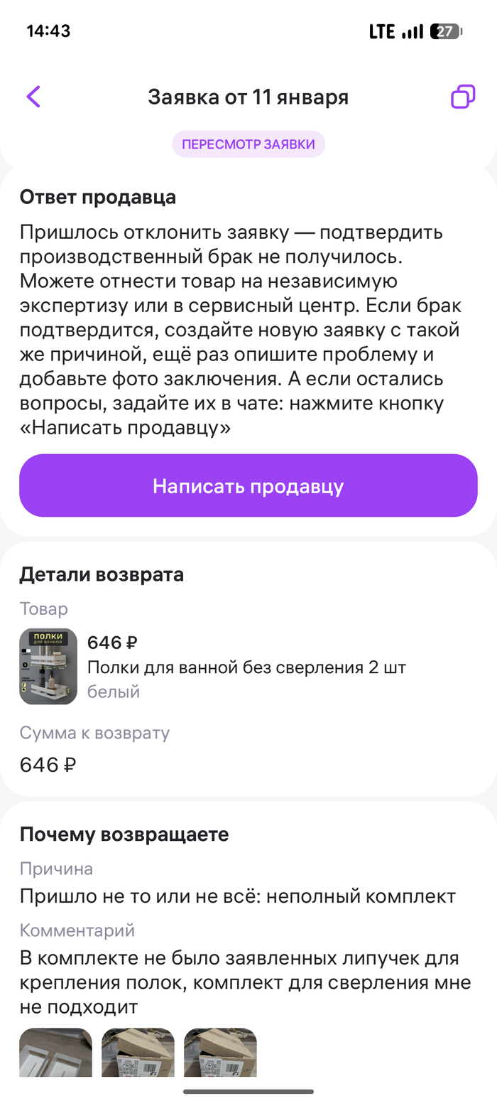 Оформила заявку на возврат, приложила фото. По правилам площадки сначала заявление рассматривает продавец, на что он ответил:
