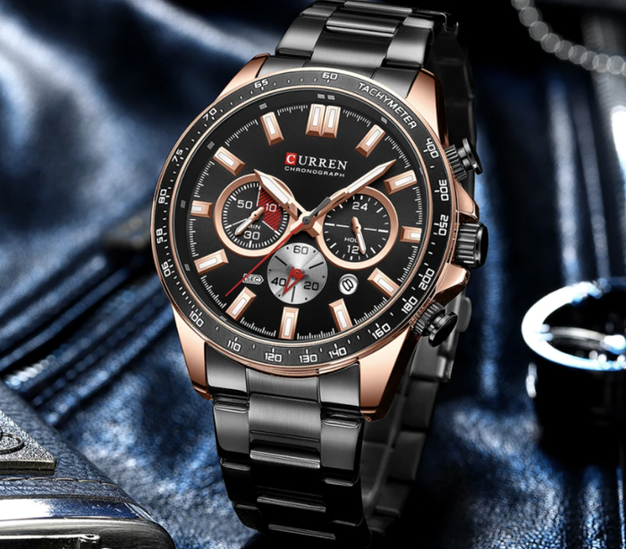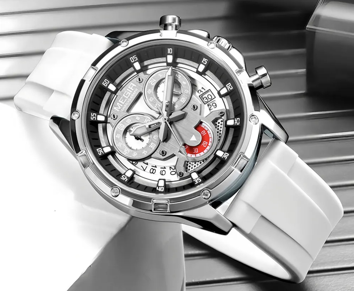 Спортивный дизайн с массивным корпусом и циферблатом с несколькими шкалами. Надёжный кварцевый механизм, кожаный ремешок и устойчивость к влаге. Подходят на каждый день или как подарок мужчине.