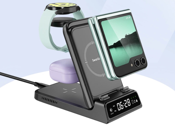 Вертикальная зарядная станция с мощностью 15 Вт для смартфонов с поддержкой Qi. Позволяет удобно поставить телефон на стол и одновременно заряжать.
