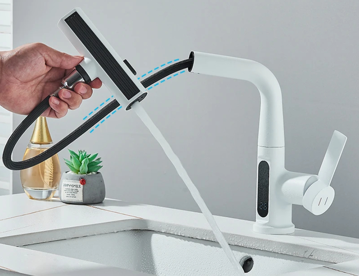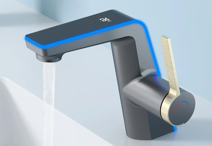 Современный смеситель с ЖК-дисплеем температуры воды. Работает без батареек — от давления. Удобный контроль, стильный дизайн, латунный корпус. Подходит для умывальника в ванной или на кухне.