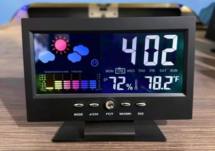 Стильный цифровой будильник в деревянном корпусе. Имеет яркий LED-дисплей, показывает время, температуру и влажность. Настраиваемая яркость и звуковая активация. Эстетичное решение для спальни, кабинета или офиса.