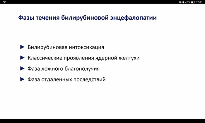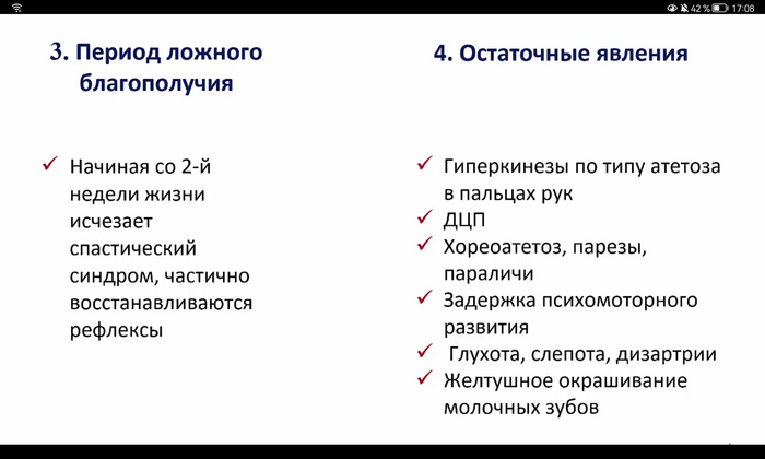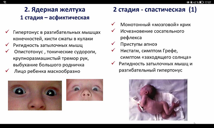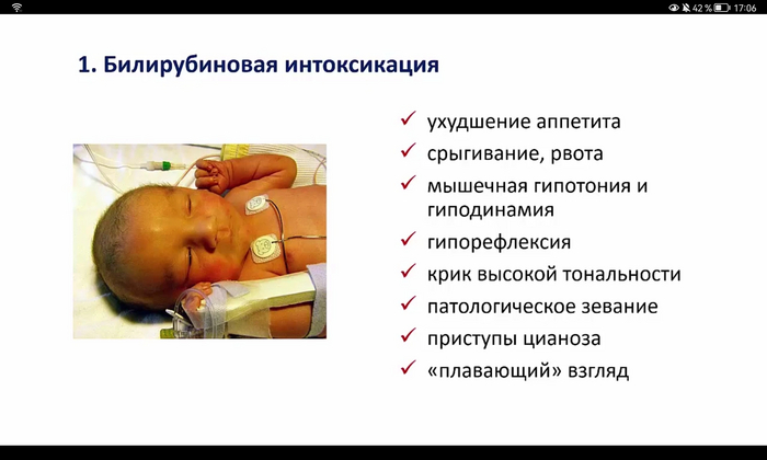 Опасное осложнение этой формы - билирубиновая энцефалопатия (ядерная желтуха), которая возникает из-за повышенного содержания непрямого билирубина. Непрямой билирубин может проникать через ГЭБ, вызывая токсичное действие на кору головного мозга, мозжечок,что проявляется судоргами, рвотой, гипорефлексией, срыгиваниями, мозговым криком, выбуханием родничка, вялостью, плохим сосанием.