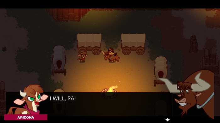 Сюжетный режим - это пиксельная адвенчура с диалогами, периодически прерывающаяся боями.