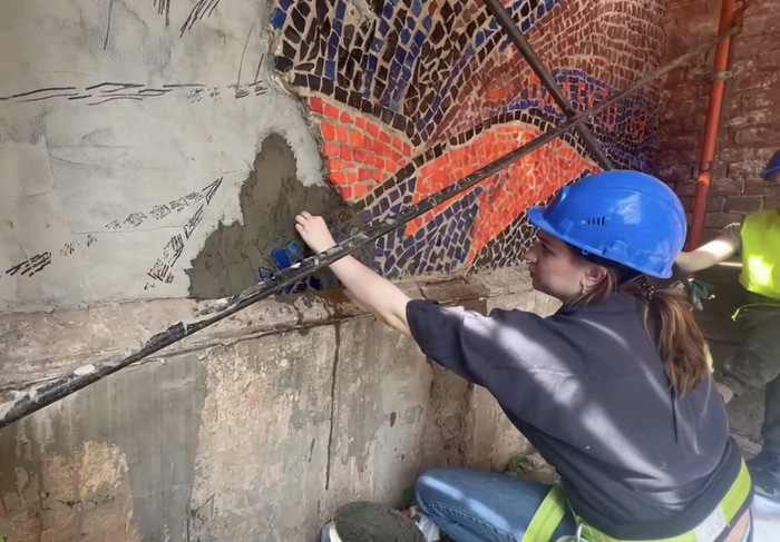Некоторые из участков мозаики еще во времена аварийного состояния целыми пластами отошли от стены и рухнули на землю. Некоторые из них не раскололись, их мы сохранили, и подготовив стену смонтировали обратно, что бы как можно больше исторических участков было сохранено и восстановлено.