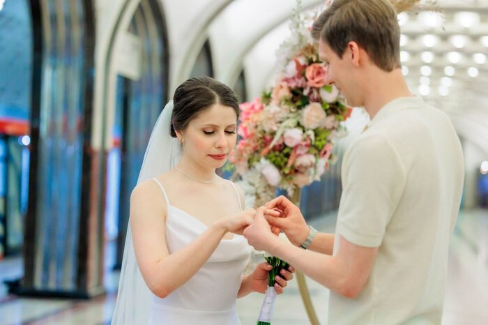 В ночь с 8 на 9 июня в московском метро прошли 4 свадебные церемонии. Разделить радостное событие вместе с молодоженами могли их родные и близкие.