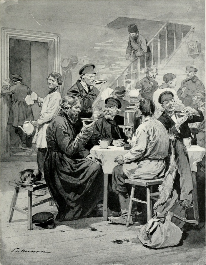 Это картина художника Frédéric de Haenen 1913 года. Точно известно, что на ней изображена Россия. Возможно, это не чайная и даже не Москва, но картинка хорошо передаёт атмосферу того, что написано в абзаце ранее. Отсюда: https://ru.wikipedia.org